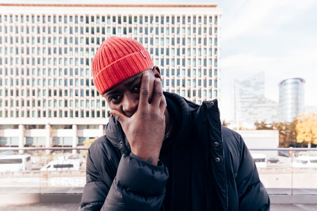 Stylish man in a red beanie and black coat looking away in a blurred city background
